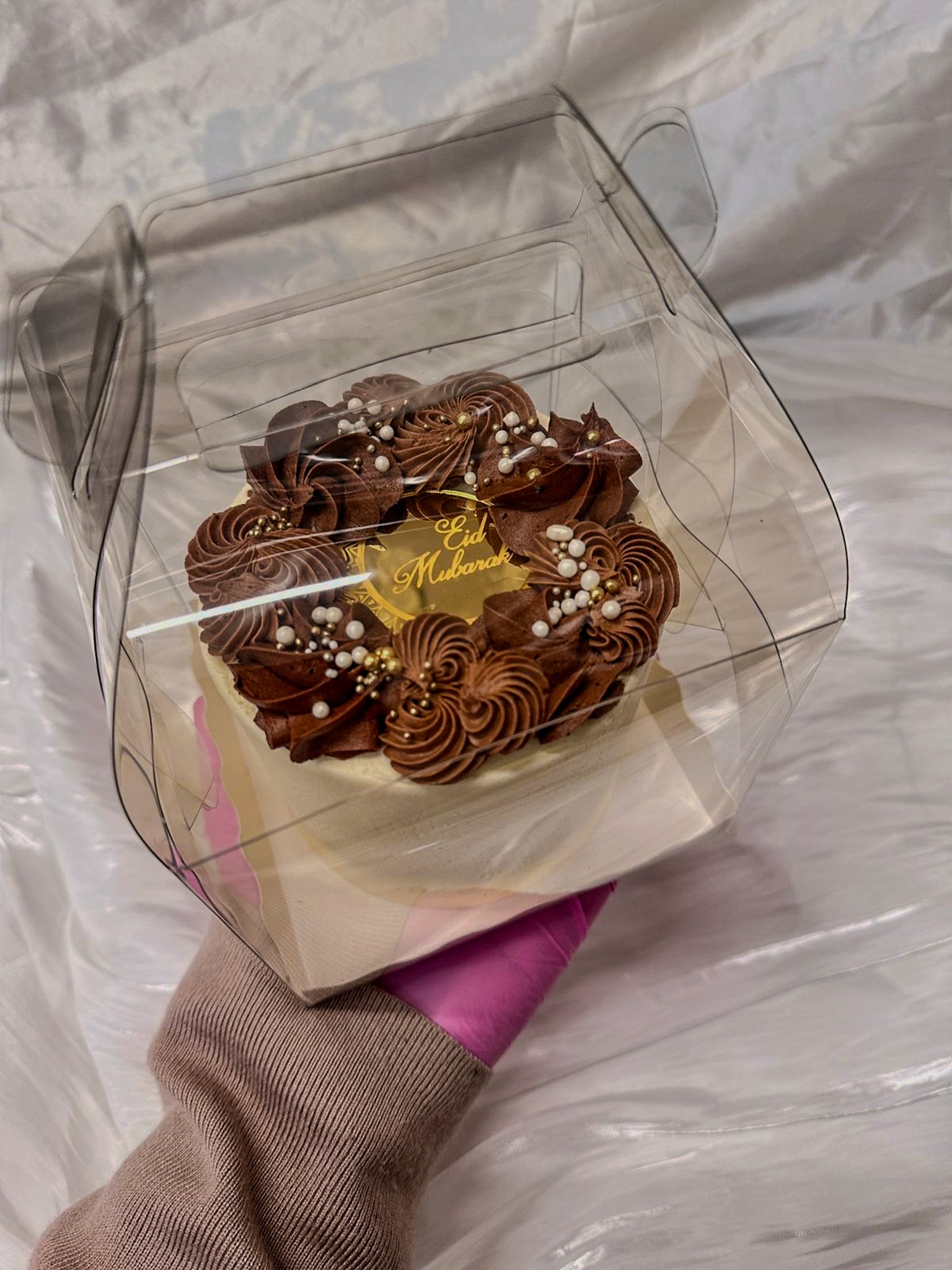This double-layer sponge cake is finished with smooth cream frosting and decorated with a rich chocolate rosette wreath, pearl sprinkles, and a gold Eid Mubarak plaque. The cake is carefully placed inside a premium clear gift box and finished with a ribbon bow, making it perfect for gifting during Eid.