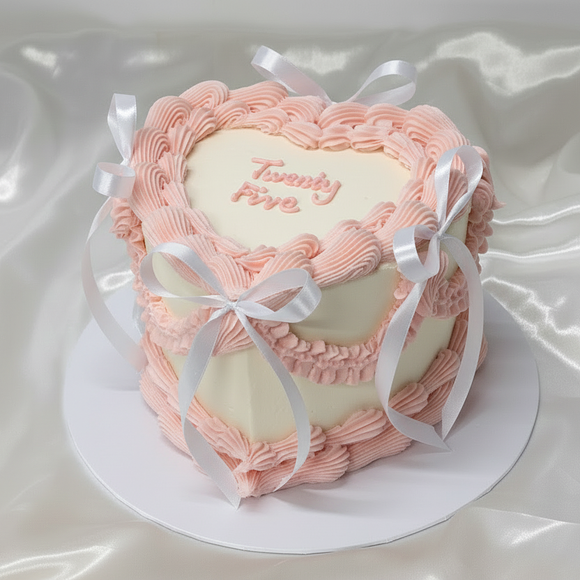 Our Vintage Coquette Heart Cake is a romantic, vintage-inspired design crafted for statement celebrations. Shaped into a classic heart and finished with soft buttercream piping, this cake is adorned with elegant satin ribbon bows for a delicate coquette aesthetic.